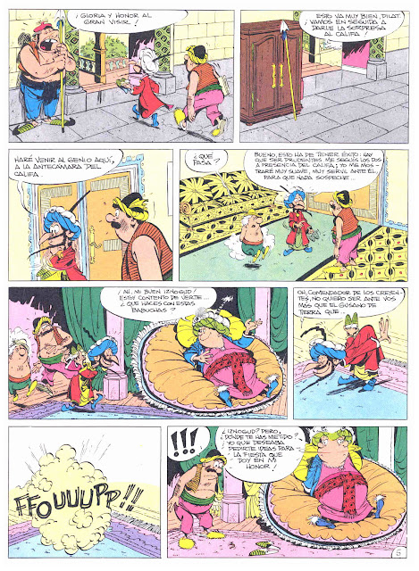 A continuación, y como homenaje al dibujante fallecido, he creído conveniente traer aquí las páginas correspondientes al primer relato del personaje, utilizando para ello la edición española de Dargaud. La verdad es que no leía nada de Iznogud —recordémoslo ahora así, con el nombre castellanizado— desde hace muchos, muchos años. Más he de reconocer que, pese a lo repetitivo en la estructura de sus historias, éstas siguen siendo bastante divertidas. Espero que las disfruten como yo lo he hecho.